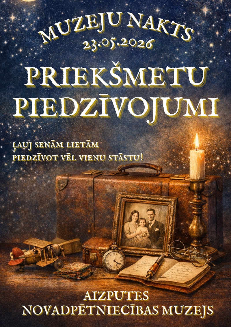 Šī gada akcijas “Muzeju nakts 2026” tēma – “Priekšmeta piedzīvojumi” – aicina ieraudzīt senas lietas ne tikai kā priekšmetus, bet kā stāstu glabātājus. Gatavojot pasākuma “Muzeju nakts” aktivitātes, Aizputes novadpētniecības muzejs aicina Aizputes un apkārtnes iedzīvotājus kļūt par īpašas izstādes līdzveidotājiem.