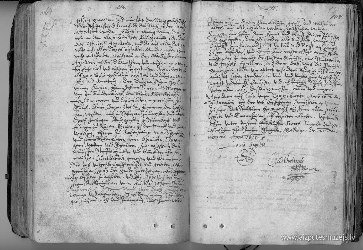Kā tad arī mūsu komisāri 1612.g. 9. janvārī mums ir teikuši, ka Aizputes pilsētiņai jāpaliek pie savām vecajām privilēģijām un paražām. Mēs to apstiprinām ar savu hercoga zīmogu un pašrocīgu parakstu. Dots Kuldīgā, 1615.g. 25. novembrī.