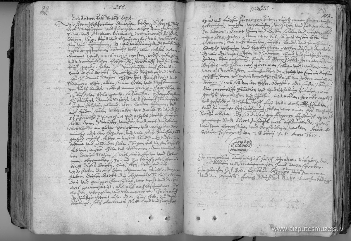 tagad un vēlāk uz mūžīgiem laikiem var paturēt, lietot, izmantot, mērīt, pārdot un ieķīlāt par tādu summu, kādu viņi grib un var, tāpat kā citu viņu īpašumu, jo mēs un mūsu mantinieki minēto pļavu pilnībā esam nodevuši viņiem, tādā veidā, ka mēs vai mūsu mantinieki un pēcnācēji tagad un uz mūžīgiem laikiem nepatur nekādus iebildumus, tiesības un tiesas pret īpašumu vai īpašnieku. Bez tam arī mēs un mūsu mantinieki esam brīvi no visiem pienākumiem pret augsto priekšniecību jeb kādu citu, kas attiecas uz minēto īpašumu, un nenesam nekādu atbildību par kaitējumiem, kas varētu notikt. Lai šo visu uzturētu stipru un nelaužamu, kā arī lielākai ticamībai, esam godājamo rāti lūguši uzspiest pilsētas zīmogu. Tas noticis Aizputē, 1617.g. 28. jūnijā.